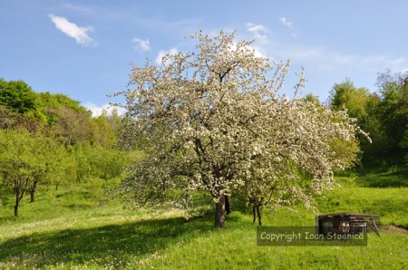 Dupa ce am traversat pe baraj, admirand albastrul lacului si dealurile verzi din jur – in special varful Clabucetul, care iese in evidenta prin inaltime si prin varful golas, ajung la marginea padurii. In stanga se face o poteca ce merge pe malul raului spre satul Plaietu, iar drumul de masina (neasfaltat, dar ok) care trece peste baraj se continua in cateva serpentine spre dreapta. Pe aici ar trebui mers, asta e drumul care duce pana in muntii Tataru. In mijloc insa, urcand drept inainte prin padure se face un alt drum, mult mai prost, si pe acolo incep si eu sa urc. E noroi pe drum dar nu ma plang, cand ma intampina un verde atat de frumos de cum intru in padure. Nu merg mult si drumul se termina, ajungand la marginea padurii langa un gard cu o poarta de fier. Poarta se deschide, asa ca urc mai departe prin iarba plina de papadii albe si galbene a unei gradini incredibile! Imi amintesc de dealurile de la Slanic, unde urcam cand eram copil, si desi soarele puternic si urcusul ma epuizeaza, fiind si la inceput de drum, nu pot sa nu remarc cat de frumoasa este aceasta gradinita! E o poiana verde, cu cativa pomi fructiferi, din care un mar mare si inflorit iese imediat in evidenta. E si o casuta de lemn parasita, si cativa stupi intr-o parte (pacat ca sunt inchisi intr-un tarc de metal, strica putin aspectul gradinii). Privind in urma vedem casele din Maneciu, si desi mai de sus s-ar vedea mai frumos, parca n-as mai pleca de aici! O paturica imi lipsea, un cosulet de picnic si… cineva alaturi. Dar cum nu am nimic din toate astea, urc spre marginea gradinii, acolo unde sunt nevoit sa sar un gard ca sa ies intr-o culme si mai frumoasa! De cate ori ai simtit ca te minunezi privind un simplu copac? Ei bine acolo parca toti copacii au ceva special, forma, culoare, pozitie, imprejurimi, nu stii de ce sa te bucuri mai intai!
