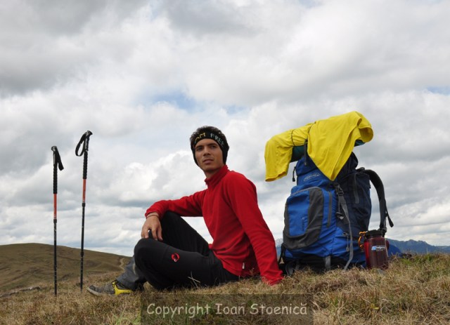 Tricoul galben cu care am urcat pana aici, l-am pus la uscat pe rucsacul albastru. Iar eu cu polarul rosu m-am asezat strategic pentru a face o poza plina de un sentiment patriotic, unul care sa nu fie impus de cineva/ceva exterior mie, ci un sentiment de bucurie ca Romania e atat de frumoasa, si ca eu m-am nascut aici. Dar cate mai am de descoperit inca in tara asta… mi-e teama un pic ca pierd prea mult timp scriind acest text, cand ar fi trebuit sa fiu pe un munte acum. Neee, nu e deloc timp pierdut, nici daca l-as scrie doar pentru mine. Si merita sa ma chinui fixand aparatul pe smocuri de iarba sau pe pietre, chiar daca nu mereu sta cum ar trebui…