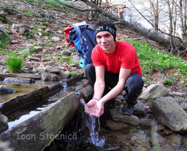 De aici incepe si urcusul sa fie mai pronuntat, asa ca ma opresc intr-o poienita unde gasesc o masa de lemn cu bancuta, si mananc ceva. In valea din padure se aud niste fluieraturi, dar nu ma mai bag in seama. Incep sa urc, stand si cu gandul la fapul ca n-am mai luat apa, si pe creasta probabil imi va fi mai greu sa gasesc. Mai am doar un litru la mine. Urmeaza o poiana cu o stana pe dreapta, si cativa cai care pasc insirati pe creasta dealului, uitandu-se la mine. Apoi drumul imi scoate in cale si un izvor amenajat (mai mult pt vite probabil, dar bun si pt oameni). Sunt doi barbati mai sus pe deal care lucreaza la o casuta de lemn, si ii intreb daca e buna de baut apa. “E foarte buna! Daca ai dupa ce!” imi spune. “Pai dupa atata mers, chiar am dupa ce!” Profit si ca sa ma spal putin, apoi beau pe saturate si urc mai departe.