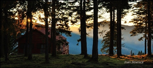 cabanuta si soare printre copaci