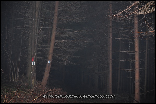 Padurea invaluita in ceata si in noapte.