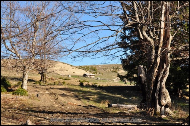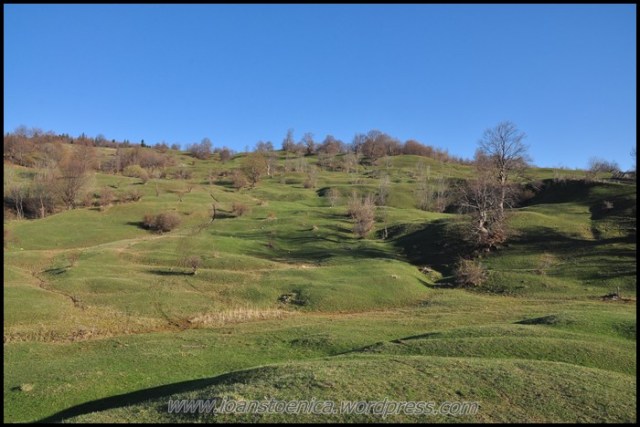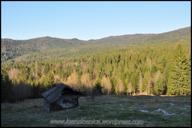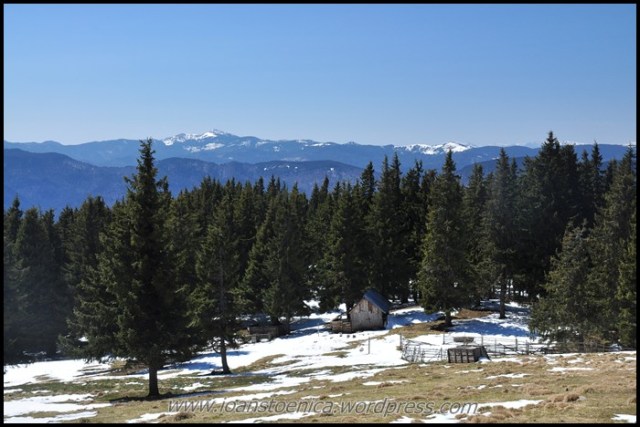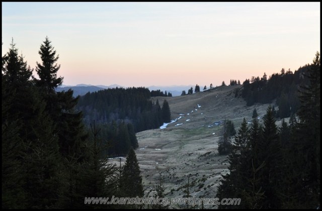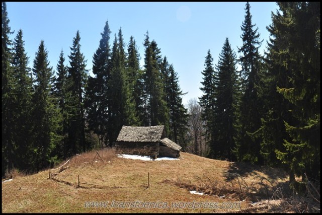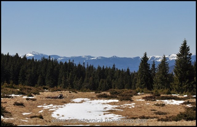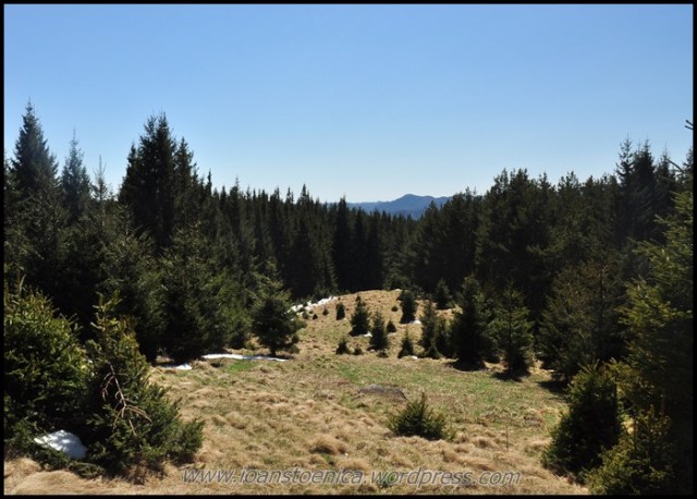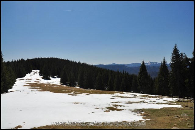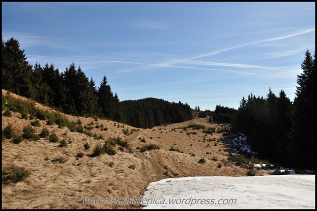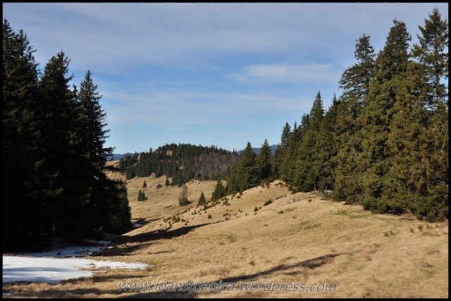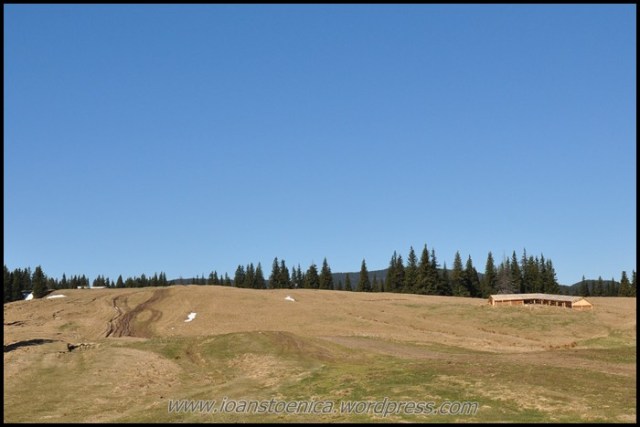 Portiunea de padure nu dureaza mult si imediat ajung la golul alpin. De unde urc pe un drum destul de clar, cand pe iarba moale si uscata, cand pe pamant. Cateva petice de zapada se scurg in siroaie micute spre vale si vantul anunta apropierea de culmea dealului. In zona sunt mai multe stane, dar oile n-au urcat inca la ele.