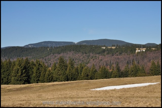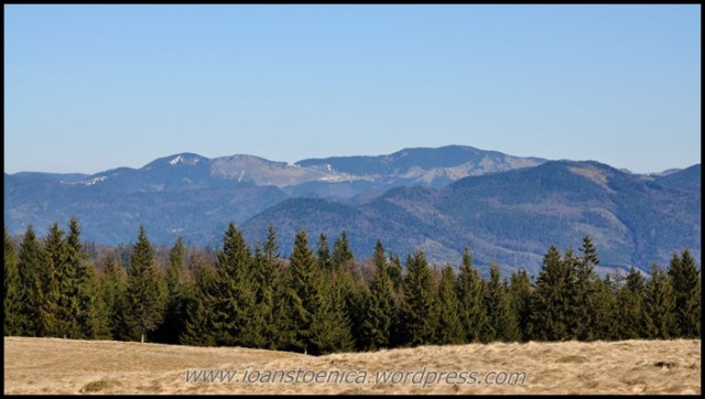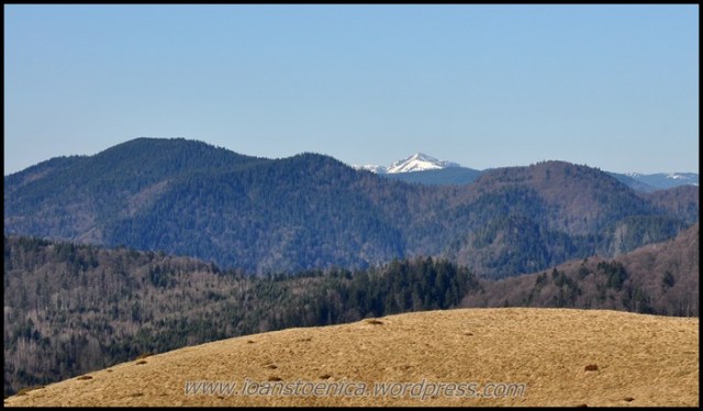 Si mai spre stanga (vest) se vede varful Zboina Frumoasă, punctul cel mai inalt unde urma sa ajung. Acolo se vede mai multa zapada intr-o poienita de sub varful impadurit.