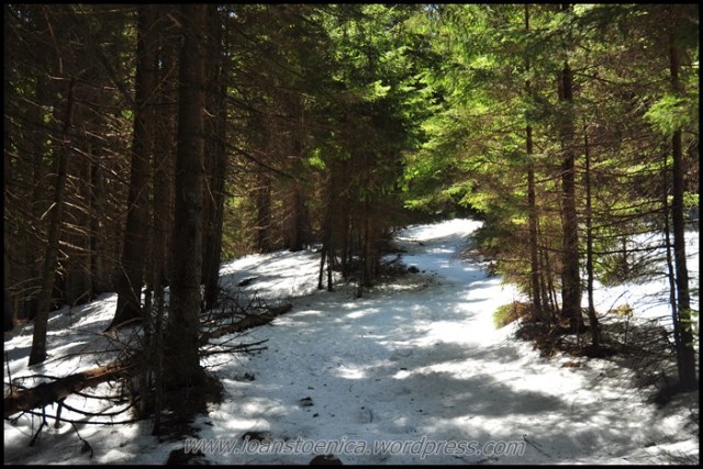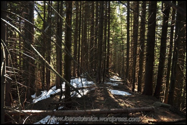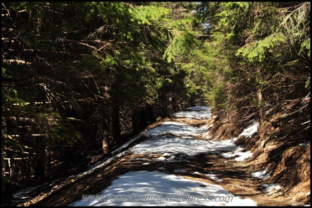 Afara e inca soare si asa va fi toata ziua, se vede usor asta daca privesti spre cer. Drumul ma poarta pe la margini de padure, dar traseul ma incanta, chiar daca petele de zapada incep sa fie tot mai multe.