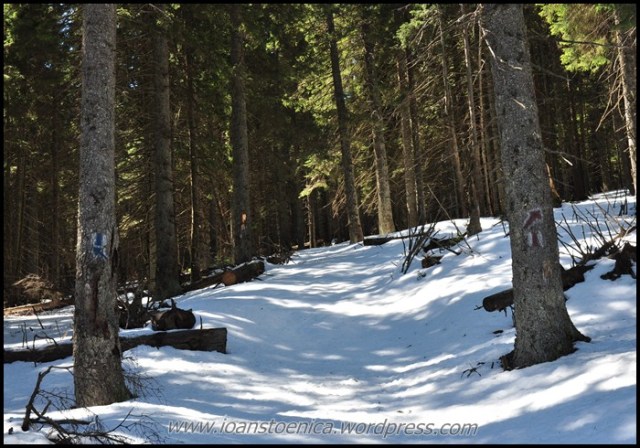 Am inceput asadar urcusul final spre Zboina Frumoasa, urmarind cele doua marcaje si inaintand cu greu prin zapada inca mare din padure.