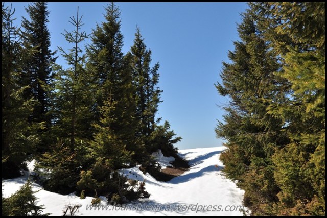 Padurea e atat de linistita insa, doar pasarile se aud ciripind. Iar razele soarelui ce-mi incalzesc urcusul sunt cumva in armonie cu zapada cea alba. Pe-aici am simtit ca pot spune in sfarsit despre aceasta tura ca este ”ultima tura de iarna, intaia tura de primavara”. Pana acum am sperat asta in privinta ultimelor 3 ture, care din ”prima tura de primavara” – asa cum speram sa fie, se dovedeau a fi ”ultima tura de iarna”. Dar niciuna nu fusese ultima. Acum insa am simtit ca sunt intr-adevar la granita, am simtit ca primavara e mai puternica si iarna nu mai poate face nimic in acest sens. Chiar daca imi ingreuna mie mersul pe acest urcus destul de lung.