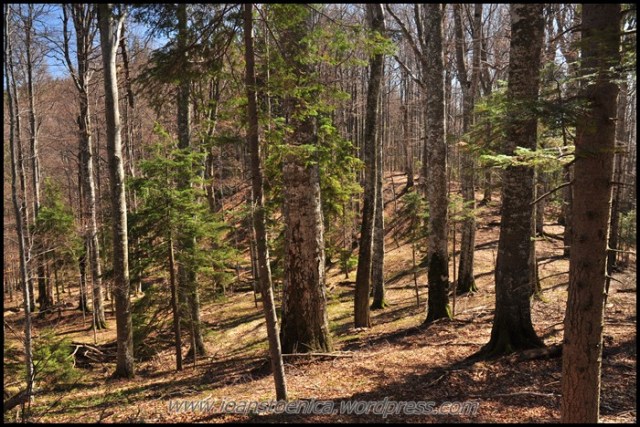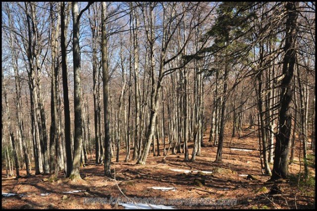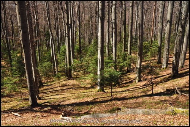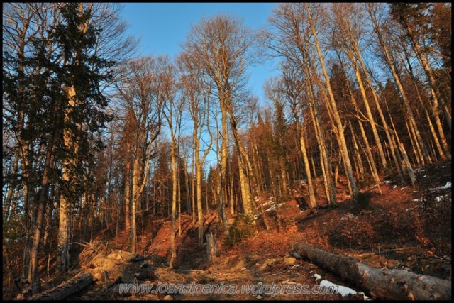 Si iata-ma intrat in padurea de fag. Ce bucurie! O asteptam, cu mirosul ei de frunze uscate si lumina calda ce patrunde usor printre crengi. E atat de diferita de padurea de conifere, de traseul pe care am mers pana acum… Nu e asa timida, te lasa sa o patrunzi mai usor, sa o vezi, te elibereaza de tensiunea gandurilor si emotiile de a nu vedea, te face sa mergi zambind, vesel pentru locul si momentul in care te afli – si nu atent prin umbrele intunecate sa zaresti din timp o eventuala miscare suspecta.