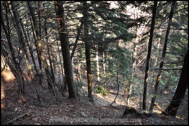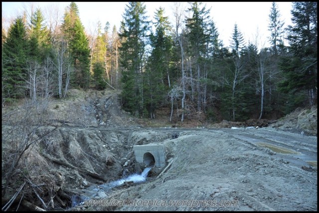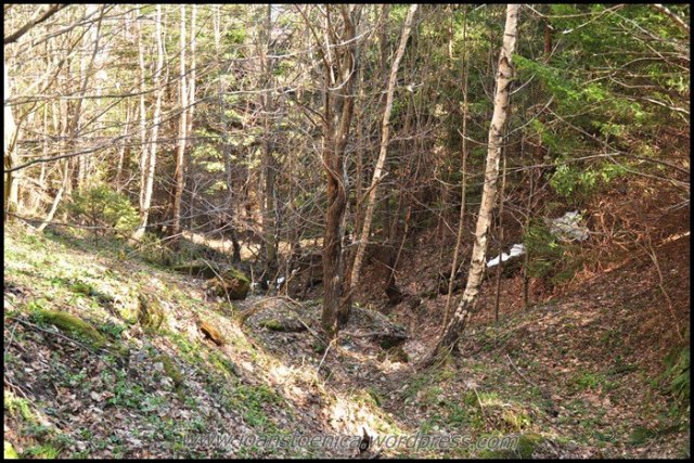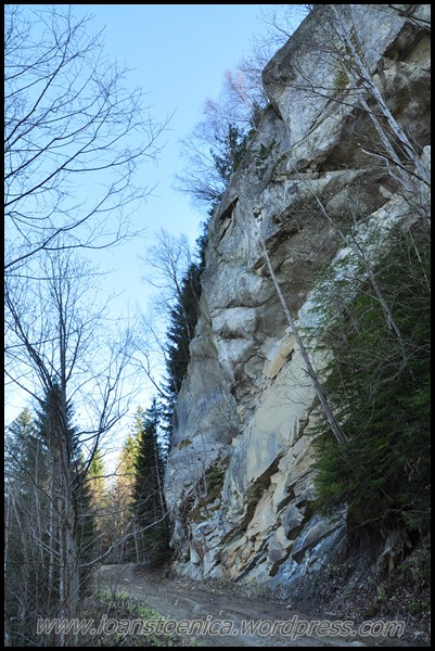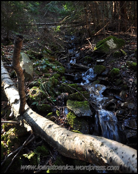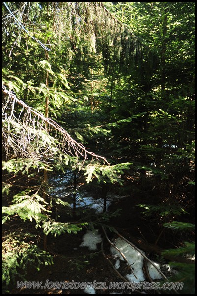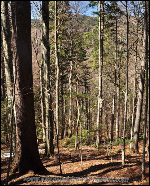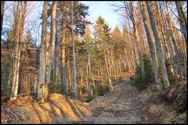 Cu greu pornesc mai departe, incaltand iar bocancii uzi de la zapada si lasati la soare sa se usuce. Nu-mi venea sa plec cand ma gandeam ca de acum incep deja coborarea, dar de fapt aceasta coborare nu am simtit-o deloc ca pe un final – pentru ca nici nu era asta! Si portiunea urmatoare, chiar daca avea sa ma duca la drumul forestier principal de pe vale, am simtit-o ca facand parte tot din traseul salbatic pe care mi-l doream asa mult cand am plecat de acasa. Era o culme pe care o zarisem pe google earth, parea atat de salbatica, de impadurita, de ingusta si frumoasa! Nici nu mi-a venit sa cred cand am vazut pe harta ca pe-aici a fost candva traseu marcat – dar cel putin asta mi-a dat incredere ca se poate face, ca exista o poteca – si nu voi nimeri in vreo fundatura.