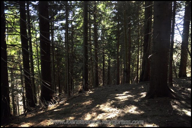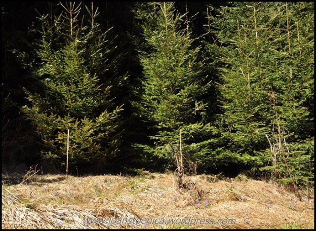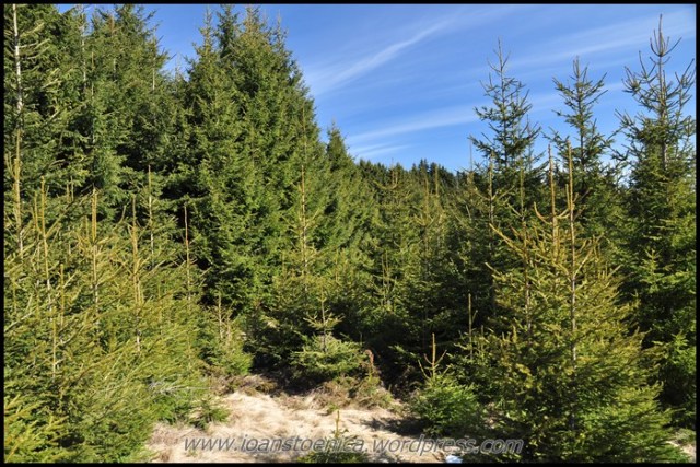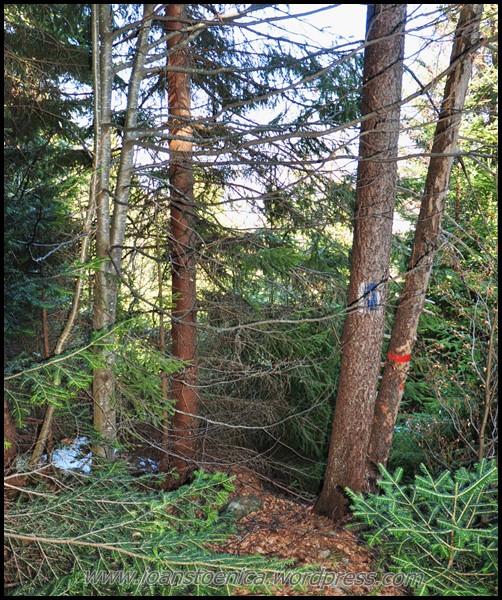 Padurea isi schimba insa rapid aspectul, revenind la intunecimea crengilor cu ace si a copacilor uscati ce imi blocheaza drumul. Regasesc puiutii de brad de data trecuta, aceia ce-mi limitau vederea la doar cativa metri in jurul meu. E incredibil pe unde te poarta marcajul, prin ce desisuri de crengi ce par sa fi crescut dupa mult timp de la crearea traseului. Si de cand ele au crescut, nimeni nu pare sa mai fi trecut pe-aici.