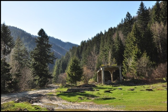 Putin mai jos, la marginea poienii, gasesc si o stana darapanata si abandonata de cine stie cat timp si invadata de vegetatie.