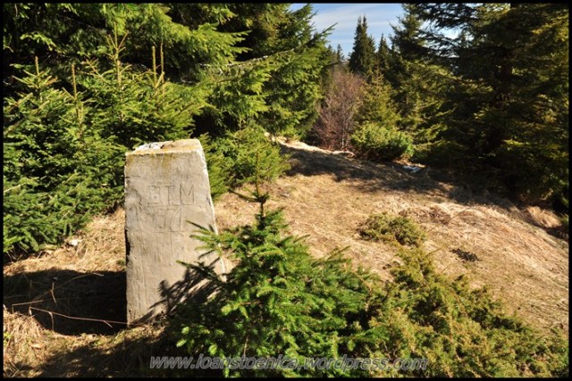 Dintr-o mica sa poteca face stanga, dar eu zaresc printre copaci un varfulet ce pare sa ofere privelisti frumoase. Asa ca ma strecor printre arbori si uscaciuni si ies la lumina. Vai, dar unde am nimerit? Pe un varf superb, secret, ascuns in mijlocul muntilor, al naturii salbatice, un varf ce pare sa nu mai fi fost atins de multa vreme de oameni. Poate ultimii care au trecut pe-aici au fost cei ce au montat mica borna de piatra de pe el. Ei, dar nu cred asta si nici nu conteaza. Conteaza senzatia pe care ti-o da prezenta ta in acel loc.