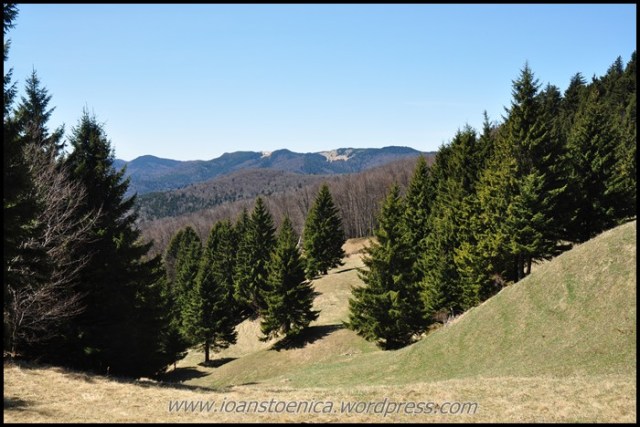 Padurea de conifere e foarte inalta, drumul e evident si dupa vreo 30 de minute de mers foarte rapid ies din padure si ajung la primele case. Cat m-am bucurat ca nu m-am dus spre Nereju! Nereju e o localitate frumoasa, dar e pe vale – drumul principal e marginit de culmi de dealuri si nu vezi mare lucru in parti sau in departari. Aici insa esti deasupra dealurilor si a vailor, casele sunt risipite parca pe toate culmile – pe unele mai mult, pe altele mai putin… si drumul merge pe la inaltime! Peisajele sunt frumoase, desi se simte putin lipsa primaverii (culorile erau inca putin mohorate, cenusii).