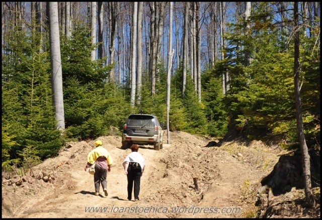 Pornesc grabit pe drumul de pamant ce intra in padure, spre Vintileasca. Spre manastire se indreapta un Atv, cateva masini de teren dar si oameni pe jos – cateva femei urcau din greu panta abrupta, si nu pareau genul care merg regulat la biserica – erau mai degraba genul de turisti care au lasat masina pe margine si s-au hotarat sa urce si ei pana la manastire. Mai jos chiar am gasit cateva masini pe marginea drumului noroios.