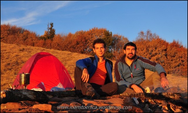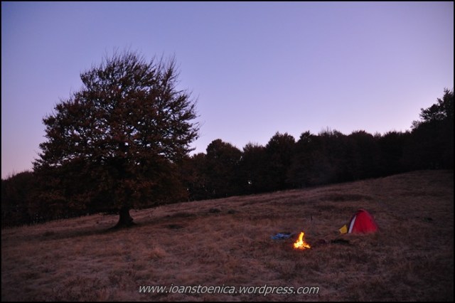 Frigul s-a lasat rapid odata cu lasarea serii, iar vantul risipeste usor caldura focului. Si de aceasta data am gasit un loc unde focul fusese deja facut, cercul de pamant ars arata ca dupa un foc de tabara – era foarte mare. Asa ca am stat linistiti in privinta asta – nu e de gluma, au fost o multime de incendii toamna asta pe munte din cauza unor focuri scapate de sub control. Si e asa usor ca flacarile sa evadeze spre padure.