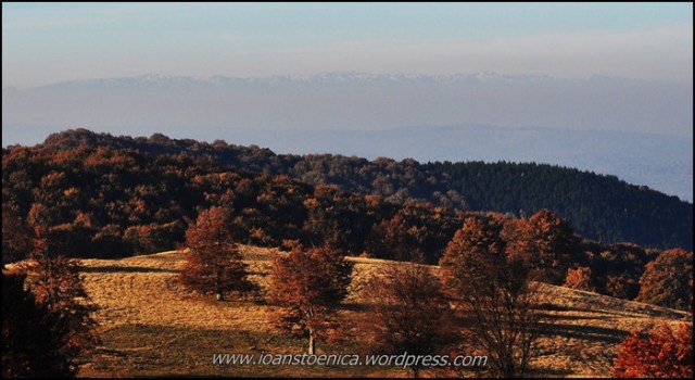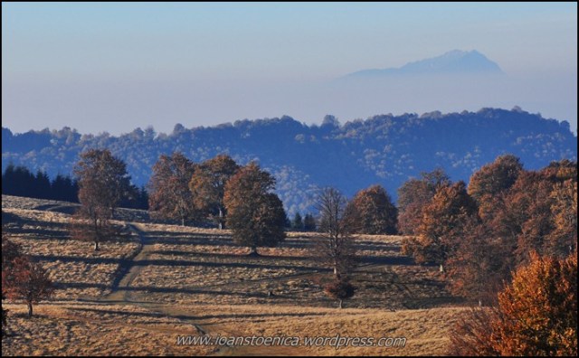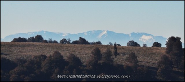Pe aici copacii sunt parca si mai plini de frunze – chiar daca sunt destul de uscate, ele dau un aspect foarte… tomnatic acestei culmi. In spate de tot (centru) vedem suprapuse unul peste altul varfurile Dealul Burdei (sub care pusesem si noi cortul) si varful Cărpiniș – cel mai inalt din acesti munti.