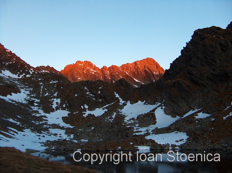 Rasaritul langa lacul Caltun. Prima raza de soare apare desigur pe cel mai inalt varf din zona. Apoi incepe si coboara…